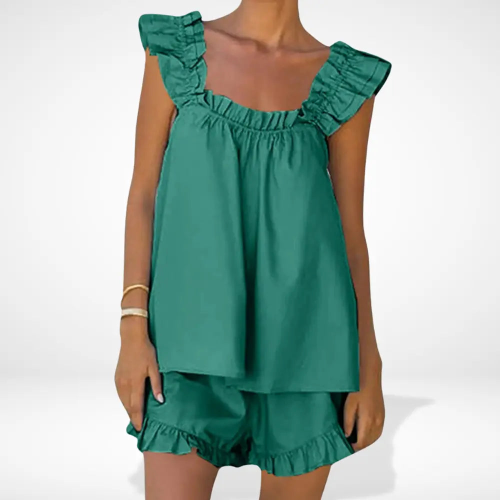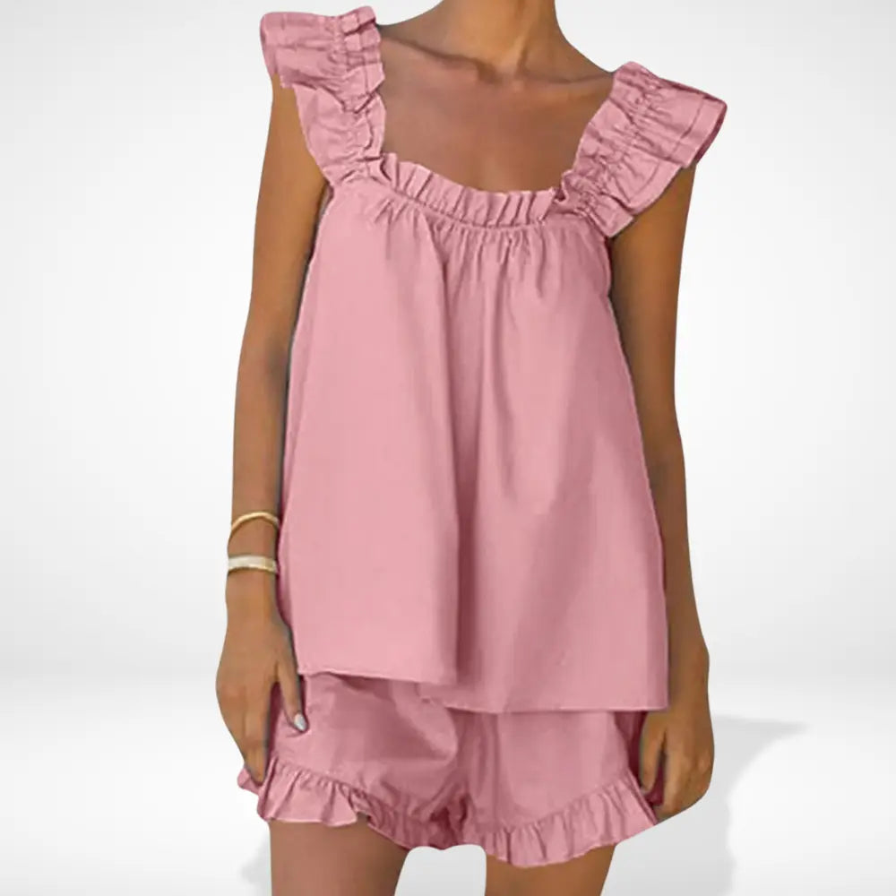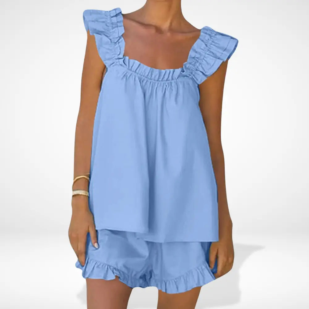 Cet ensemble de détente pour femmes est conçu pour allier douceur et liberté de mouvement. Son haut à volants et son short assorti offrent une silhouette fluide, idéale pour les moments de repos à la maison ou les journées détendues. Une pièce légère à l’allure soignée.